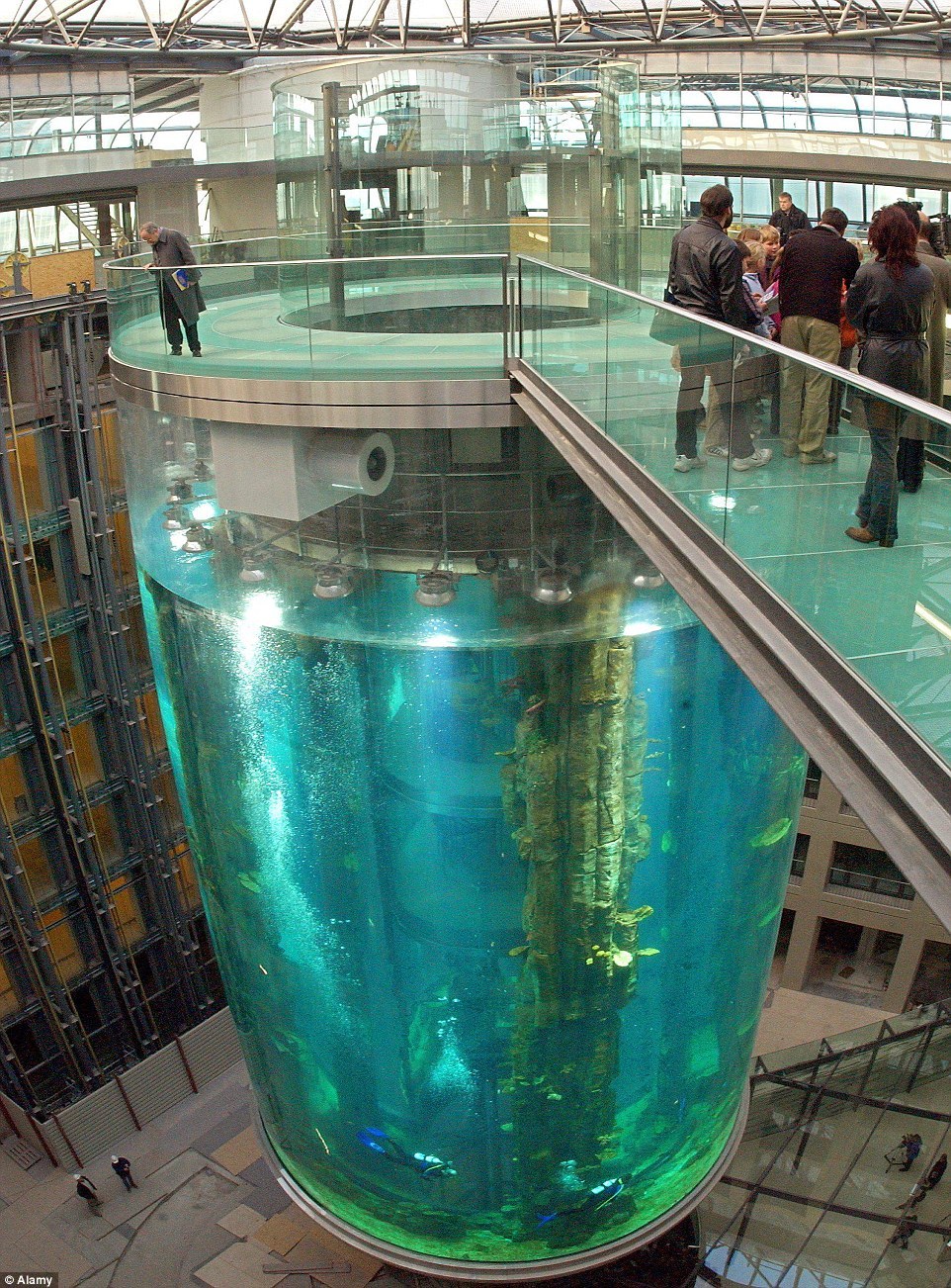 这个世界上最大的独立圆柱体水族箱就坐落在德國柏林的雷迪森酒店,高25米,大概是8层楼那么高。水族馆里足足有100万公升水。