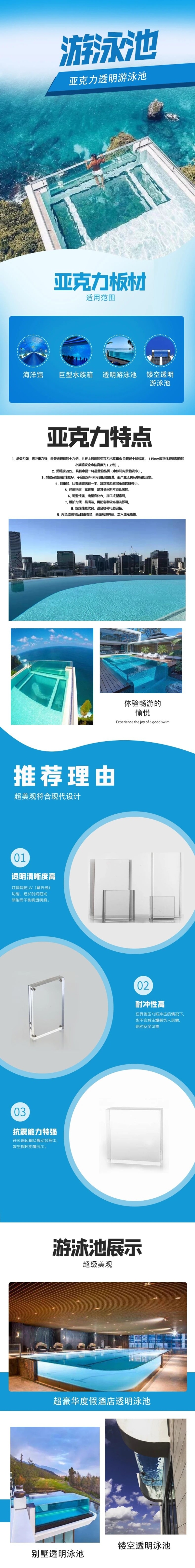 过分便宜的亚克力有可能是用回收料再生产出来的,性能比全新料低很多,在户外用个几年就会发黄、脆化,不满足亚克力泳池的建造要求。 因此在购买时要尽量选择品牌厂家的全新料亚克力板,多方进行比价、拿样测试后再最终决定。 此外的大头就是亚克力泳池的人工费用。 泳池的设计、建造,板材的运输等都要请专业的亚克力泳池厂家帮助。 在选择厂家时要了解对方在业内的名气,落地的经典项目案例等等,确保对方的设计风格、报价满足自己的需求。 其他还要购置好亚克力泳池的建造的必须材料、设备,如防水胶、水处理设备等,交由亚克力泳池厂家或者其他专业人员安装。